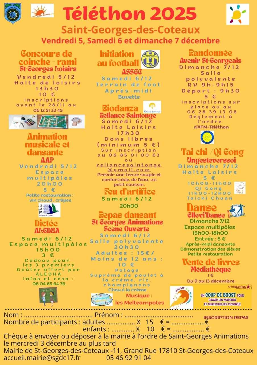 Renseignements et résas : animations Téléthon à Saint-Georges-des-Côteaux 05 46 92 91 04