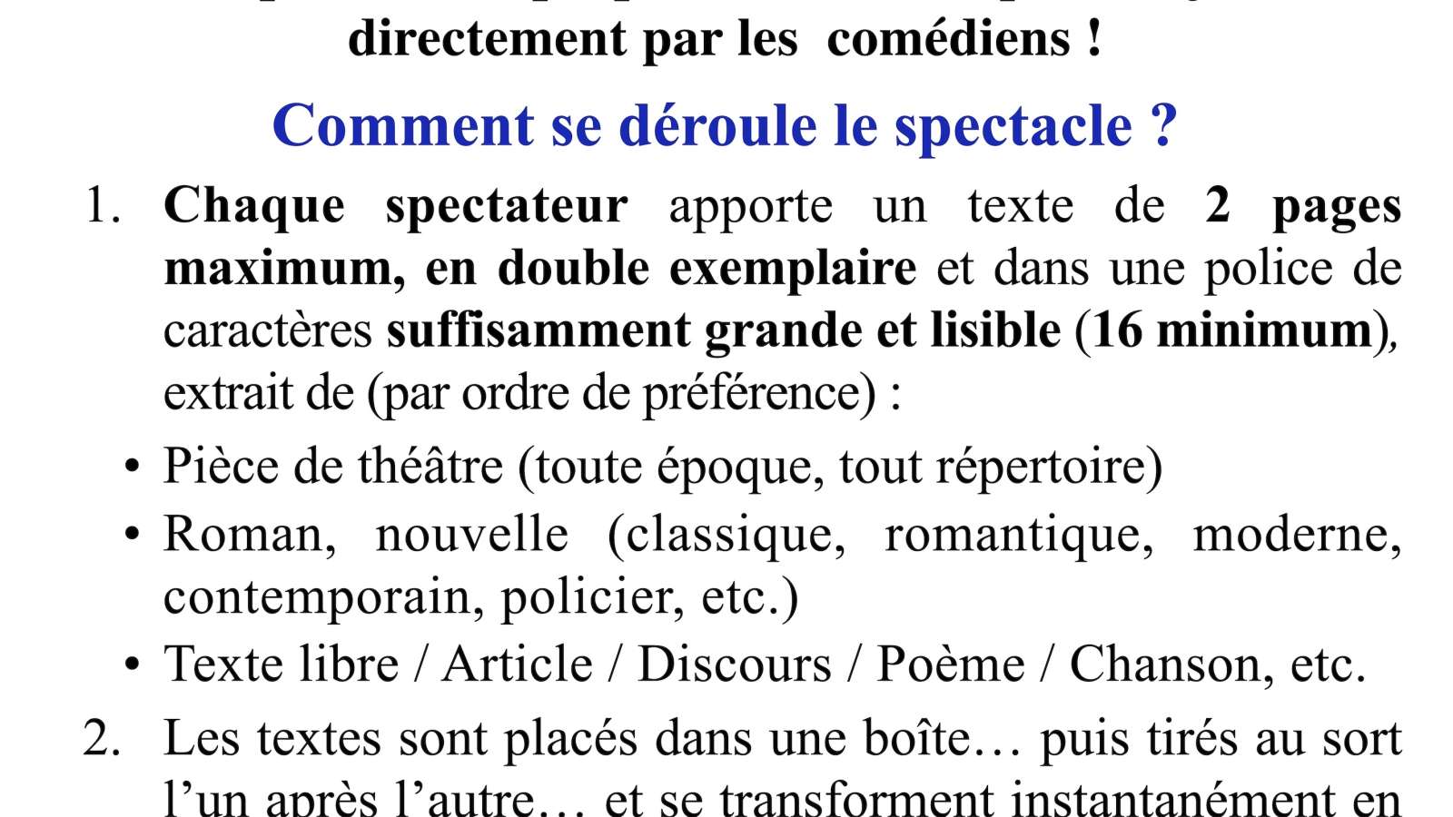 Chaque spectateur apporte un texte de 2 pages maximum, en double exemplaire et dans une police de caractères suffisamment grande et lisible (16 minimum), extrait de (par ordre de préférence) :