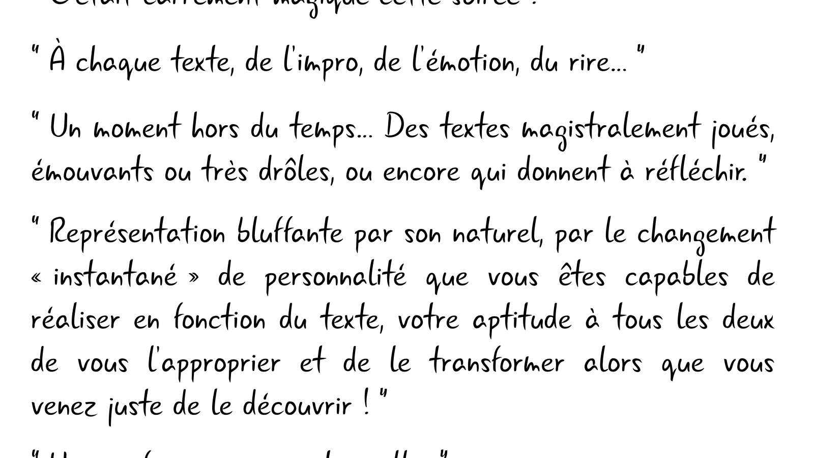 Les textes sont placés dans une boîte… puis tirés au sort l’un après l’autre… et se transforment instantanément en scènes de théâtre jouées à l’improviste par les deux comédiens… À partir de là, tout est possible et vous risquez d’être surpris !