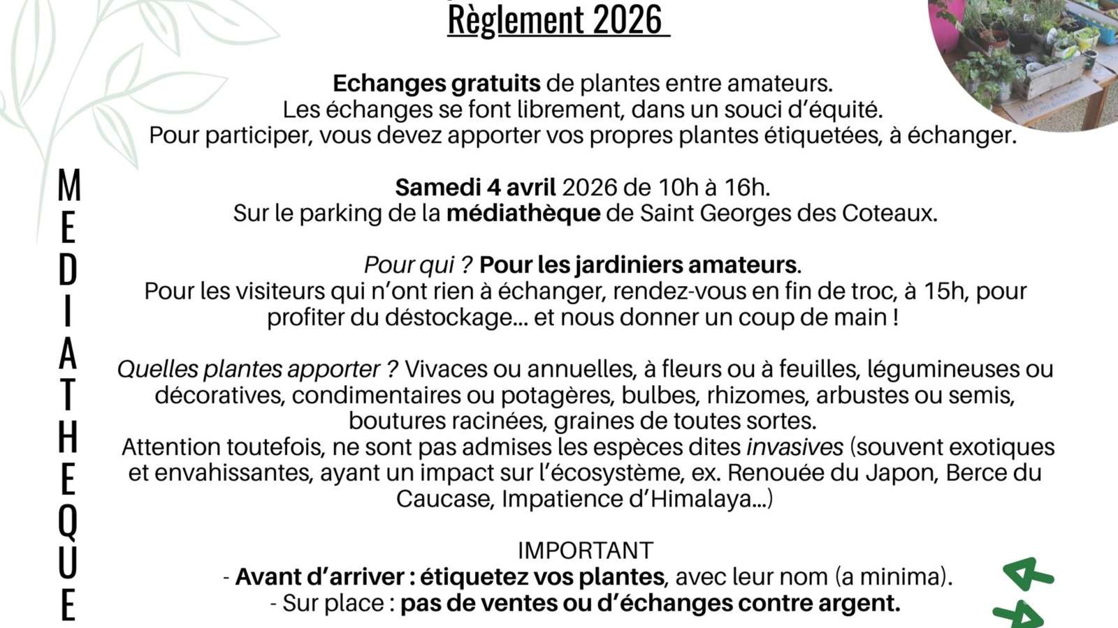 Les échanges se font librement, dans un souci d’équité. Pour participer, vous devez apporter vos propres plantes étiquetées, à échanger.