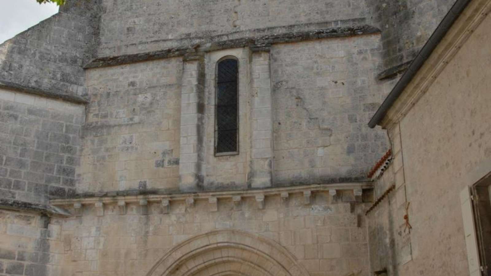 Le clocher latéral dont il ne subsiste que la partie inférieure, également d’époque romane, s’élève sur le bras nord du transept.
