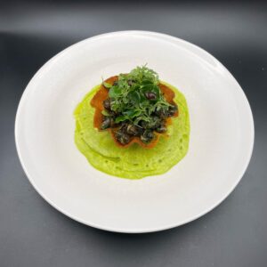 Dans les feuilles de brick cuites, déposer la chair à saucisses, le confit de tomates, les escargots, et la salade de pousses. Pour finir, ajouter l’émulsion de persil.