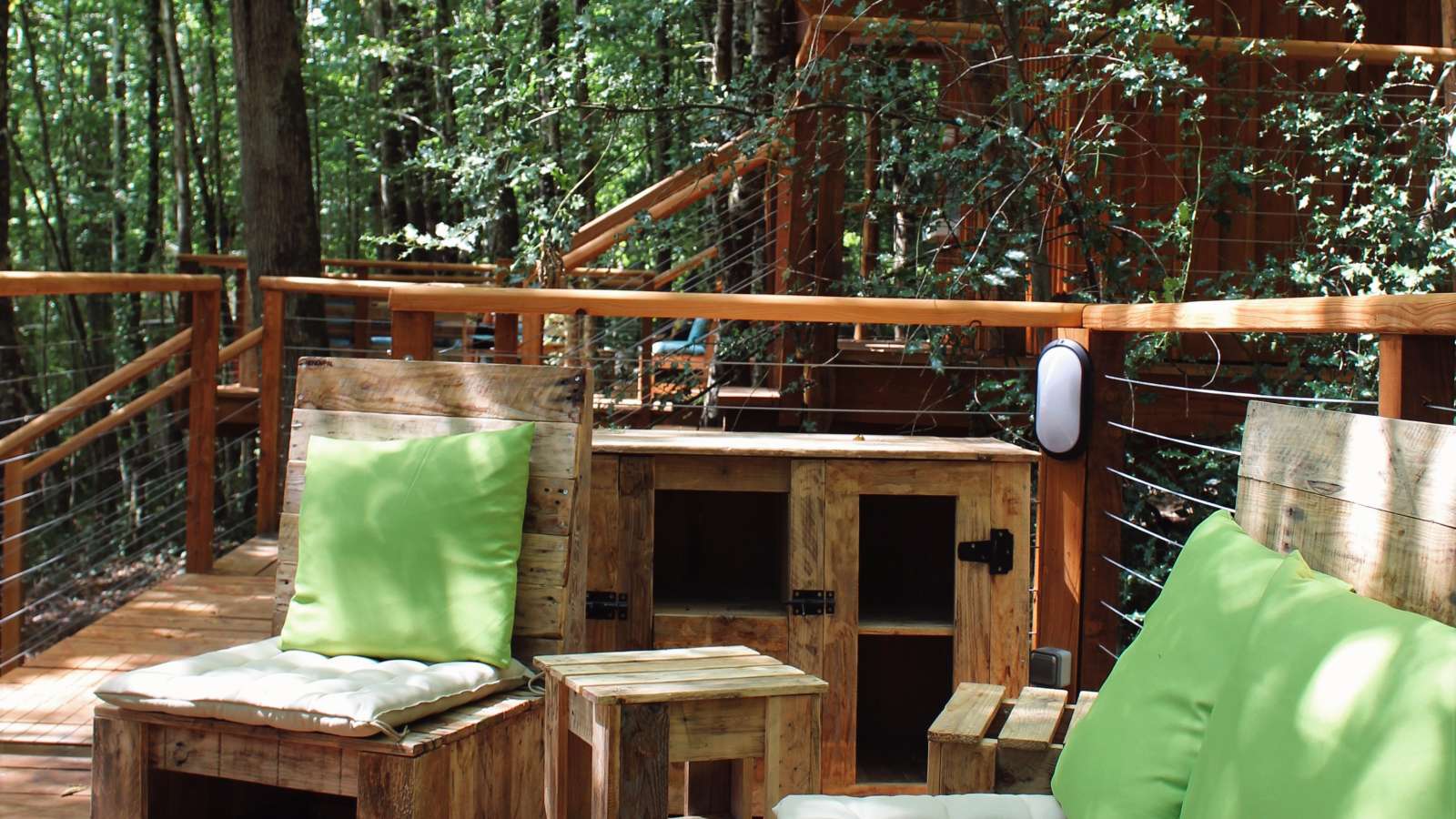 - Des terrasses montées sur pilotis au beau milieu des bois