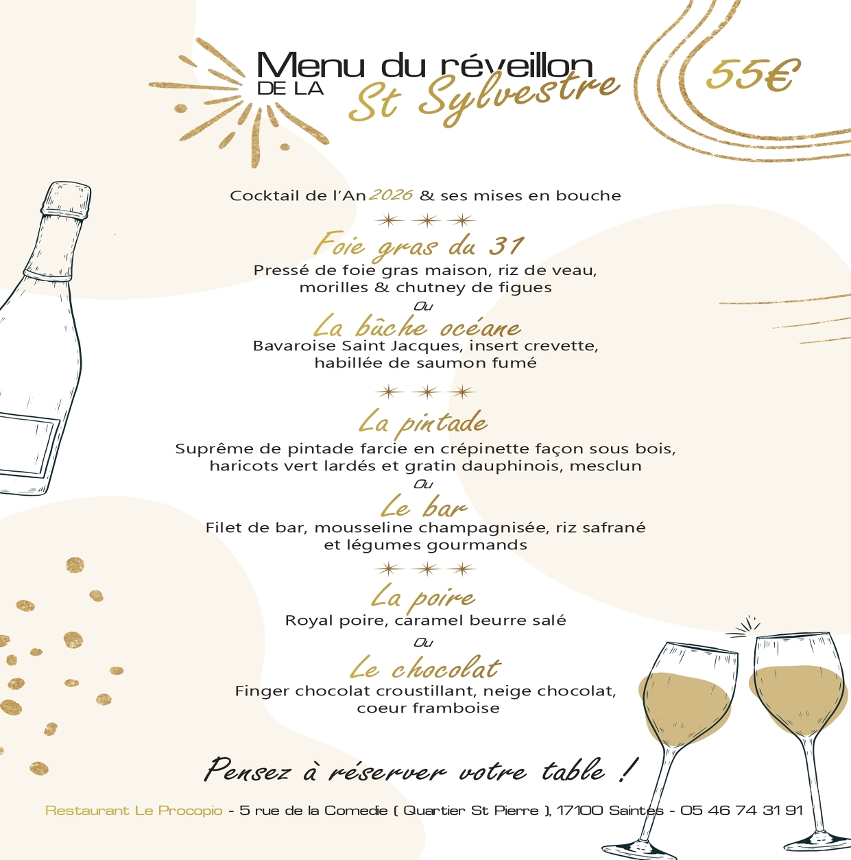 Vous êtes à la recherche de menus de fêtes de fin d’année ? Nos partenaires restaurateurs vous proposent des menus gourmands et originaux. Laissez-vous tenter et choisissez vos menus ! Ne manquer pas de consulter la liste de tous les restaurants à Saintes et en Saintonge.